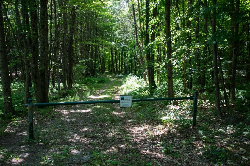 Previous Image Next Image gated entrance to trail at trail head DSC_4646 Trail head for Wilkins Campbell Forest on Wolf Hill Rd.