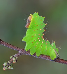 maple and found this spectacular fluorescent green silkmoth caterpillar. It has been reported that Polyphemus caterpillars sometimes make a snapping sound with their mandibles.