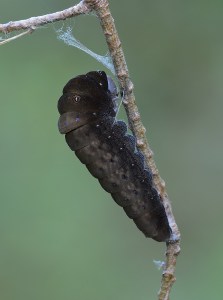 Its life as a caterpillar is nearly over, as it prepares to pupate and overwinter as a chrysalis. Just prior to pupation, the caterpillar turns from green to dark brown and spins a silken girdle around the thorax to hold the chrysalis in an upright position.