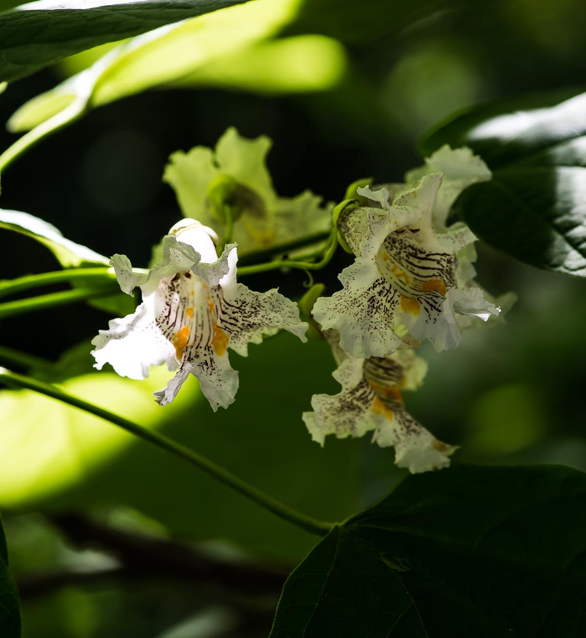 Previous Image Next Image northern catalpa flower DSC_6575 A flower of a Northern Catalpa. The yellow and purple stripes uiide bees to the nectar