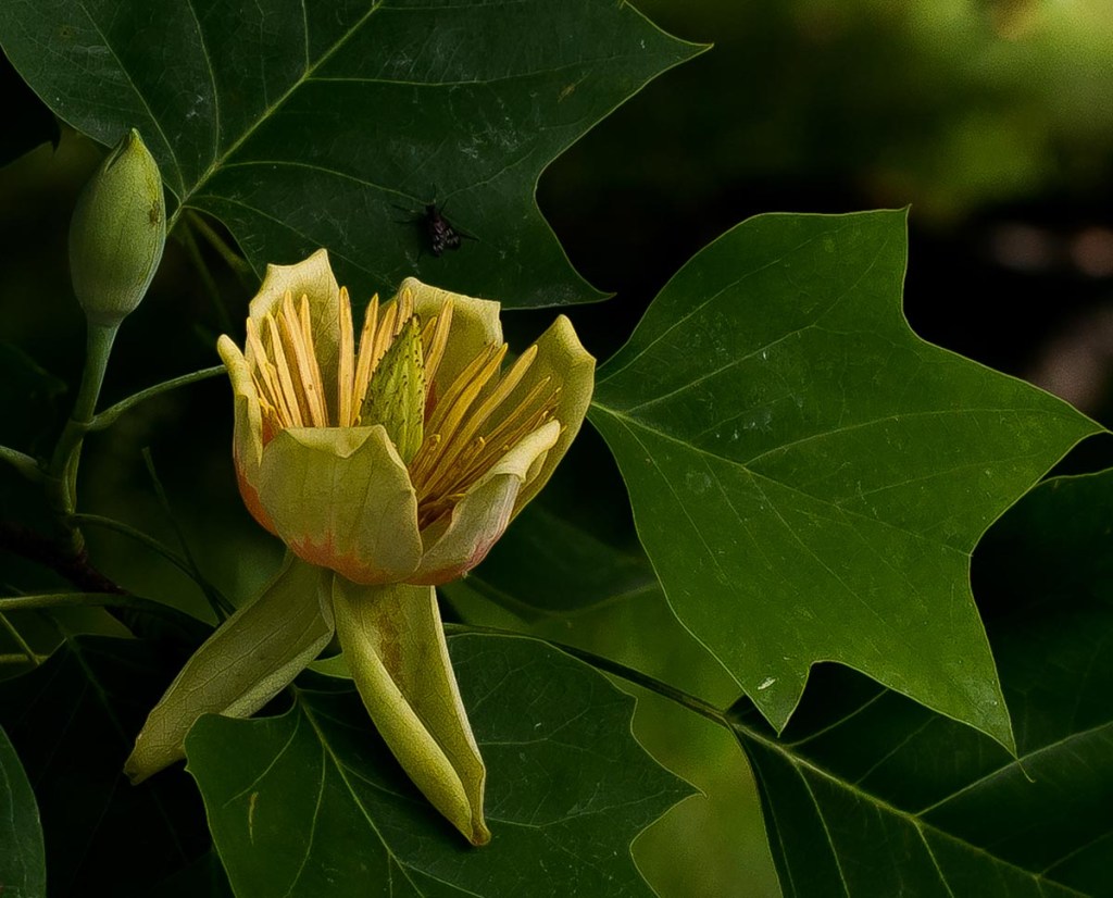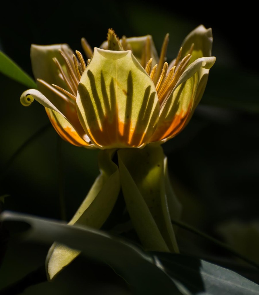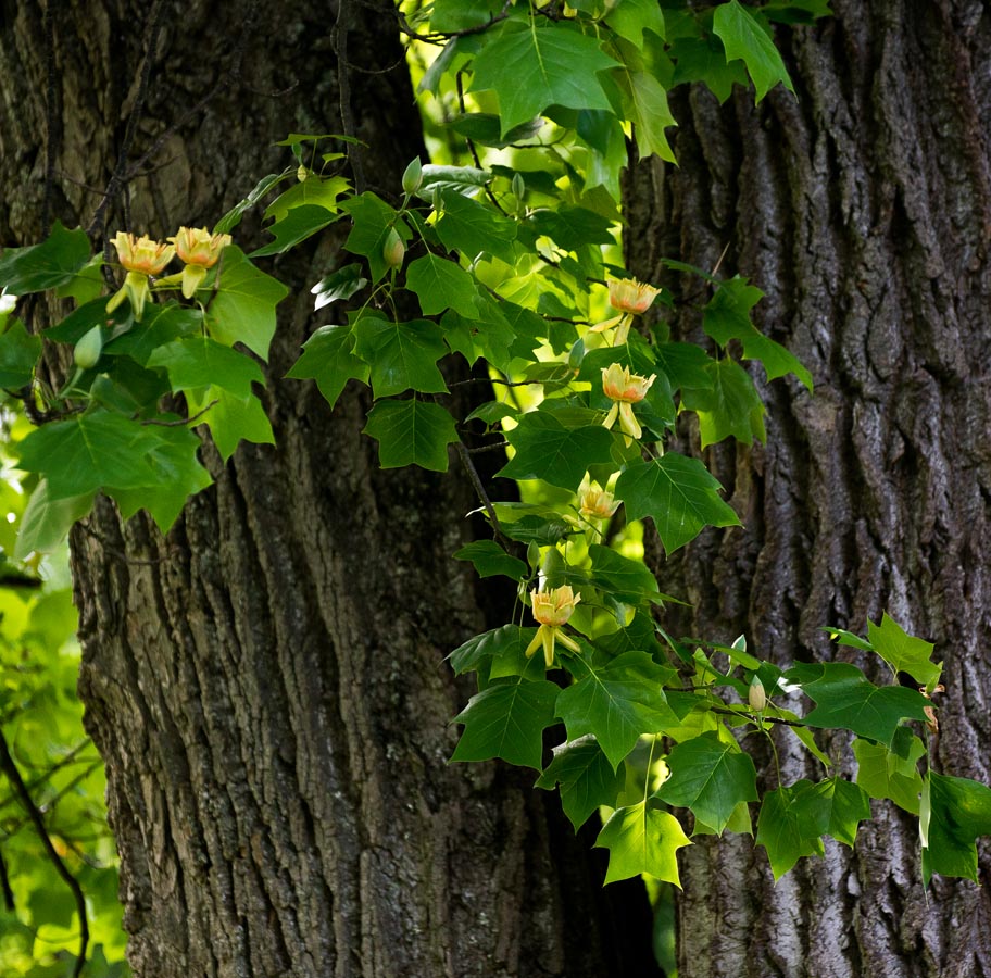 Tulip poplar is related to Magnolia, and their flowers are similar. But while the flowers of Magnolia are, basically, white or pink, the flowers of tulip poplar are orange and green. The flowers bear a superficial resemblance to a tulip. The flowers are quite beautiful and well worth a visit.