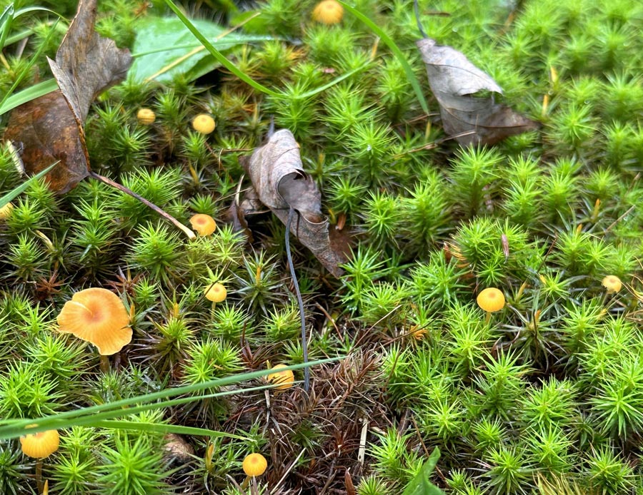 Here in Deering I have found, so far, two moss associated mushrooms: Cantharellula umbonata and Rickenella fibula. Both were associated with mosses in the genus Polytrichum., and I have found each only once.