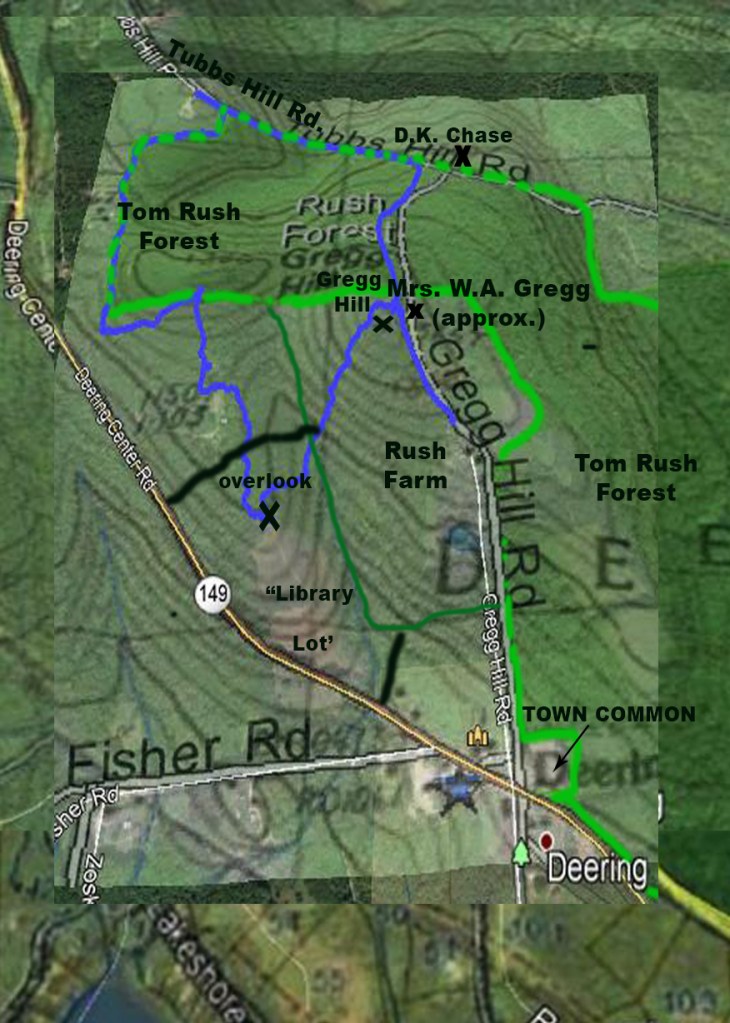 Early in the 19th Century several families lived around what is now the Tom Rush Forest, on Gregg Hill Road, Tubbs Hill Road, and Old Rangeway Road and today’s forest was all meadow – – known in part as ‘East Meadow,’ and ‘Berry field.’ Large meadows inside the Tom Rush Forest have been maintained along the east side of Gregg Hill Road, and those meadows feature in a walk (shown in red on the map) of about 1/2 mile from the Town Common, on Deering Center Rd, to the Lachance residence at the top Gregg Hill Road. We call that walk the Tom Rush Meadow Walk.