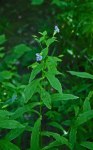 With my walking stick probing the way forward I was able to get half way across, on the berm of a beaver dam when I started seeing pretty blue flowers on low growing herbs. This beaver dam was a rickety sort of thing where a wet foot or leg – – or more — was a distinct possibility. At one point, though, there was enough room to settle bit. Condense my stringy frame into a small sort of dry spot with the berm of the dam to my back and the open pond in front of me.