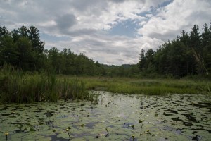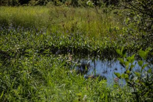 Traveling along those roads one would not imagine the beautiful wetland that lies just beyond the road and that makes up a large part of the easement. I got to experience the ‘wet’ part of the Titcomb wetland last week when I set out to walk the perimeter after heavy rain the previous day. Crashing through sensitive ferns is a wet job!. The southern boundary of the Titcomb Easement passes the edge of a large pond that is the heart of the wetland. For me and my monitoring it was at roughly the half way point. When I got to it I had to decide whether to avoid the wetland and pond by retracing my path, going way out of my way onto non conserved land to get around most of the wetland, or take advantage of this being a dry year and hope I could negotiate a thin beaver dam and step from grass tussock to tussock to get to the other side. That’s what I decided!