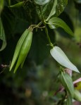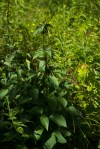 Black swallow wort is easily recognized. It’s a low growing herb with dark green leaves; the plant tends to vine. The leaves are paired, opposite each other on the stem, narrowly heart-shaped, and drawn to a fine point. The have a strongly developed central vein that causes the halves of the leaf blade to form a kind of V-shape down the length of the leaf. Flowers form at the tips of the vine and are small, dark purple. Kind of pretty actually. The fruit is a twin capsule. The roots are white and thick, forming a mat in the soil; there can be a tap root.