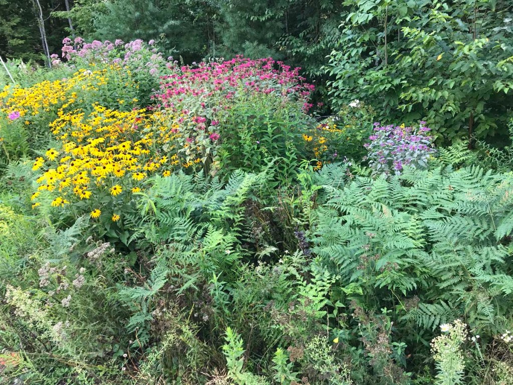 The collateral effects of the garden include apart from, of course, the pure beauty, a refugium from an otherwise pretty crappy world, a whole bunch of pollinating insects and ruby throated hummingbirds. Butterflies, bees of all sorts, and the hummingbirds dip and zoom around the flowers finding pollen and nectar among the echinacea, lavender, bee balm, Joe Pye weed … and St John’s Worts and evening primrose and lupins … the list just goes on! Caterpillars such as those of the glorious monarch butterfly find a good home here in all the untouched milkweed.