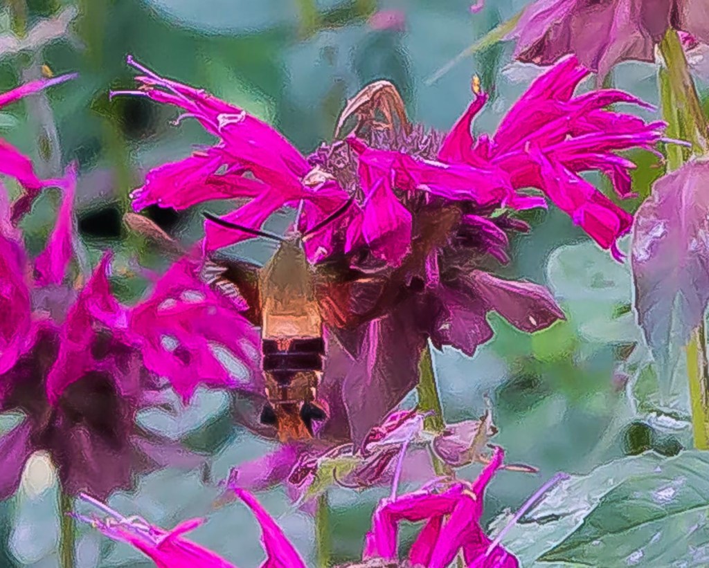 Hummingbird clearwing moth drawing nectar from monarda flowers
